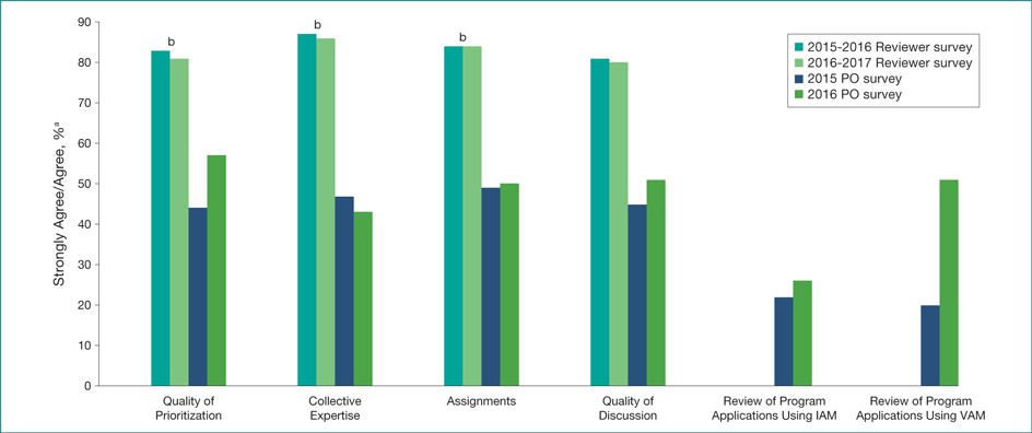 The 2015-2016 reviewer survey yielded a response rate of 47.1% (4832 of 10,262), and the 2016-2017 reviewer survey yielded a response rate of 47.0% (4807 of 10,228). The 2015 Program Officer (PO) survey had a response rate of 38.0% (348 of 916), and the 2016 replication PO survey had a response rate of 37.0% (335 of 905). IAM indicates internet-assisted meeting; VAM, video-assisted meeting.