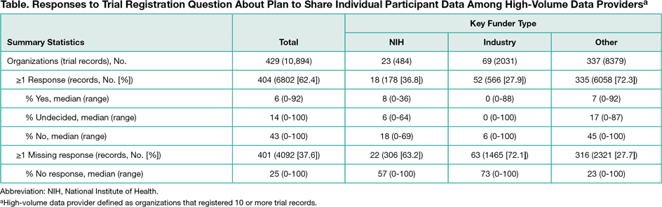 We summarized responses to IPD sharing–related questions for all interventional studies initially registered in 2016 and for the subset of trials registered by “high-volume data providers,” defined as organizations that registered 10 or more records. Organizations were categorized by key funder type, ie, were categorized as “NIH” if at least 1 National Institutes of Health institute was listed as a sponsor or collaborator, as “industry” if not classified as NIH and at least 1 company was listed as a sponsor or collaborator, and as “other” for all remaining records. Because of considerable heterogeneity in responses among the high-volume data provider subsample, we further characterized responses for trials registered by the top 10 high-volume data provider organizations within each key funder type.