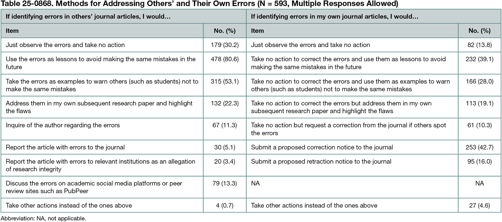 The participants reported a higher frequency of identifying errors in others’ articles than those in their own (t = 17.88; 95% CI, 0.35-0.43; Cohen d = 0.67; P < .001). Regarding identifying others’ errors, 22 items had a mean frequency above the theoretical mean of 2.5, in the categories of occasionally and seldom. The item with the highest frequency was spelling errors/omissions, followed by errors in the understanding or application of theory. For identifying one’s own errors, only the item spelling errors/omissions reached the theoretical mean of 2.5. The other 33 items, such as misunderstanding of previous research and errors in understanding theory application, ranged from 2.34 to 1.92, corresponding to seldom and never. In terms of addressing errors (multiple responses allowed; see Table 25-0868), 478 participants (80.6%) indicated that if they identify others’ errors, they would use them “as lessons to avoid making the same mistakes in the future,” 315 (53.1%) would take the errors “as examples to warn others,” and 179 (30.2%) would “just observe the errors and take no action.” As for addressing their own errors, 253 participants (42.7%) would “submit a proposed correction notice to the journal,” 232 (39.1%) would “take no action to correct the errors and use them as lessons,” 166 (28.0%) would take no action and use the errors “as examples to warn others.”