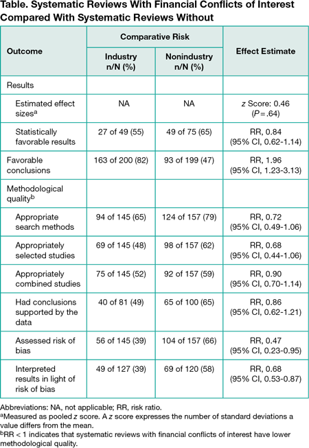 Nine observational studies with a total of 983 systematic reviews of drug studies and 15 systematic reviews of device studies were included. Effect size estimates and frequency of statistically favorable results were similar between systematic reviews with and without financial conflicts of interest (Table). Systematic reviews with financial conflicts of interest more often had favorable conclusions compared with systematic reviews without financial conflicts of interest (RR, 1.96; 95% CI, 1.23-3.13).