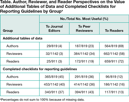Among 20,340 surveyed authors and peer reviewers, we received 2872 (14%) responses (819 [12%] from authors, 1142 [17%] from peer reviewers, and 911 [14%] from authors and reviewers responding as readers). Most authors (711 of 819 [87%]) reported submitting at least 1 type of supplementary material with their most recent manuscript, 95% (1086 of 1142) of reviewers reported seeing supplementary material in an article they reviewed at least sometimes (ie, not never or almost never), and 79% (724 of 911) of readers reported that the article they read most recently included supplementary material. Additional data tables were the most common supplementary material type submitted or seen (authors, 74%; reviewers, 89%; readers, 67%). A majority in each role indicated additional data tables were most useful to readers (58%-72%), while fewer indicated they were most useful to peer reviewers (19%-34%) and journal editors (3%-4%) (Table). Patterns of opinion were opposite for reporting guideline checklists. All 3 groups favored publication of additional data tables and figures on the journal’s website (80%-83%), with less than 4% of each group reporting that availability was not needed. Less than one-fourth of respondents in each group said that raw study data should be available on the journal’s website (16%-23%), and 24% to 33% said that these materials should not be made available.