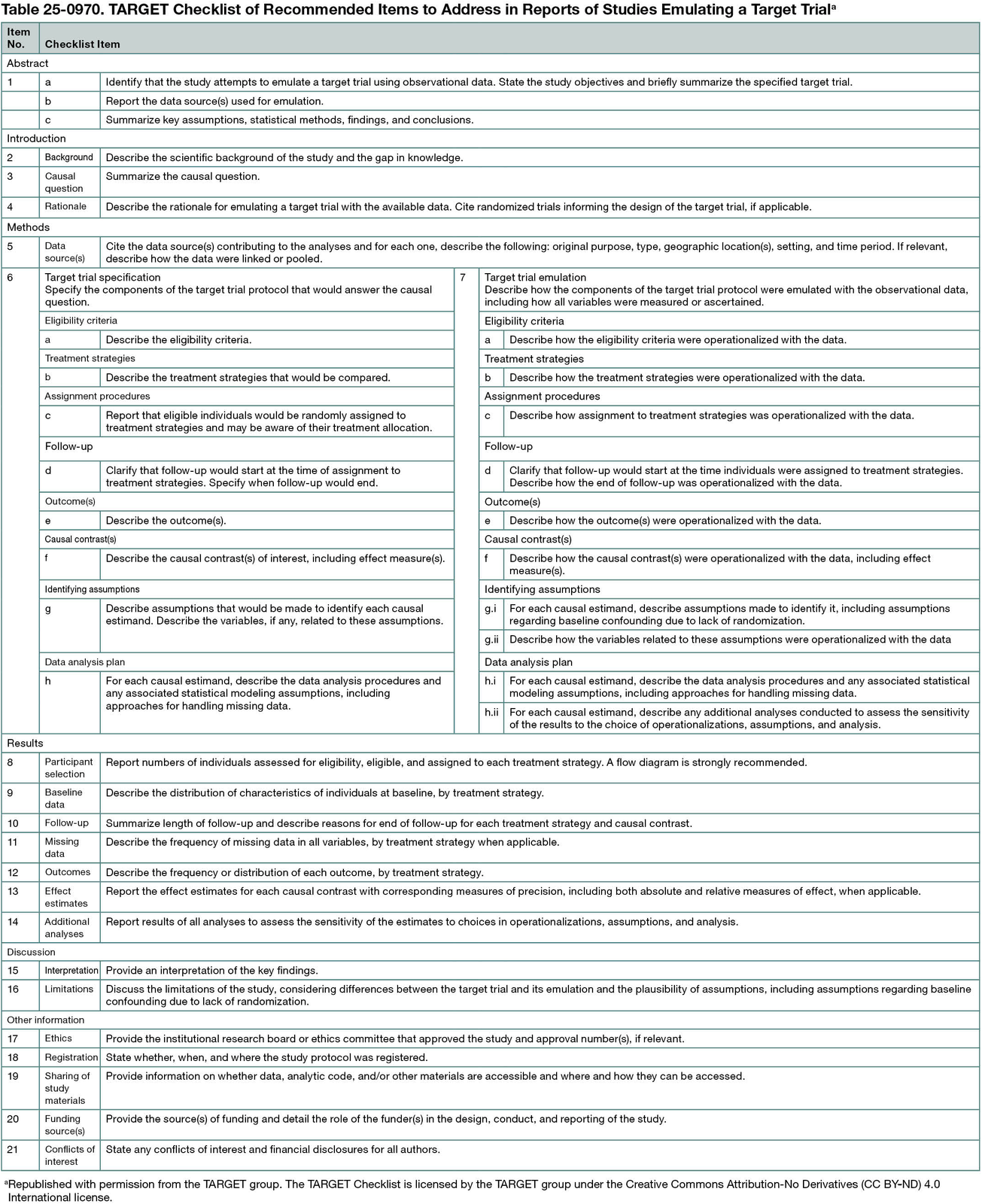 The 21-item TARGET checklist was organized into 6 sections (abstract, introduction, methods, results, discussion, other information) (Table 25-0970). The TARGET guideline was intended to be general, with a focus on nonrandomized studies of interventions explicitly emulating a parallel-group, individually randomized target trial, with adjustment for baseline confounders. Key recommendations were to (1) summarize the causal question and the reason for emulating a target trial; (2) clearly specify the target trial protocol (ie, causal estimand, identifying assumptions, data analysis plan) and how these components were mapped to the observational data; and (3) for each causal estimand, report the estimate obtained and its precision, along with findings from additional analyses to assess the sensitivity of estimates to assumptions and design and analysis choices.