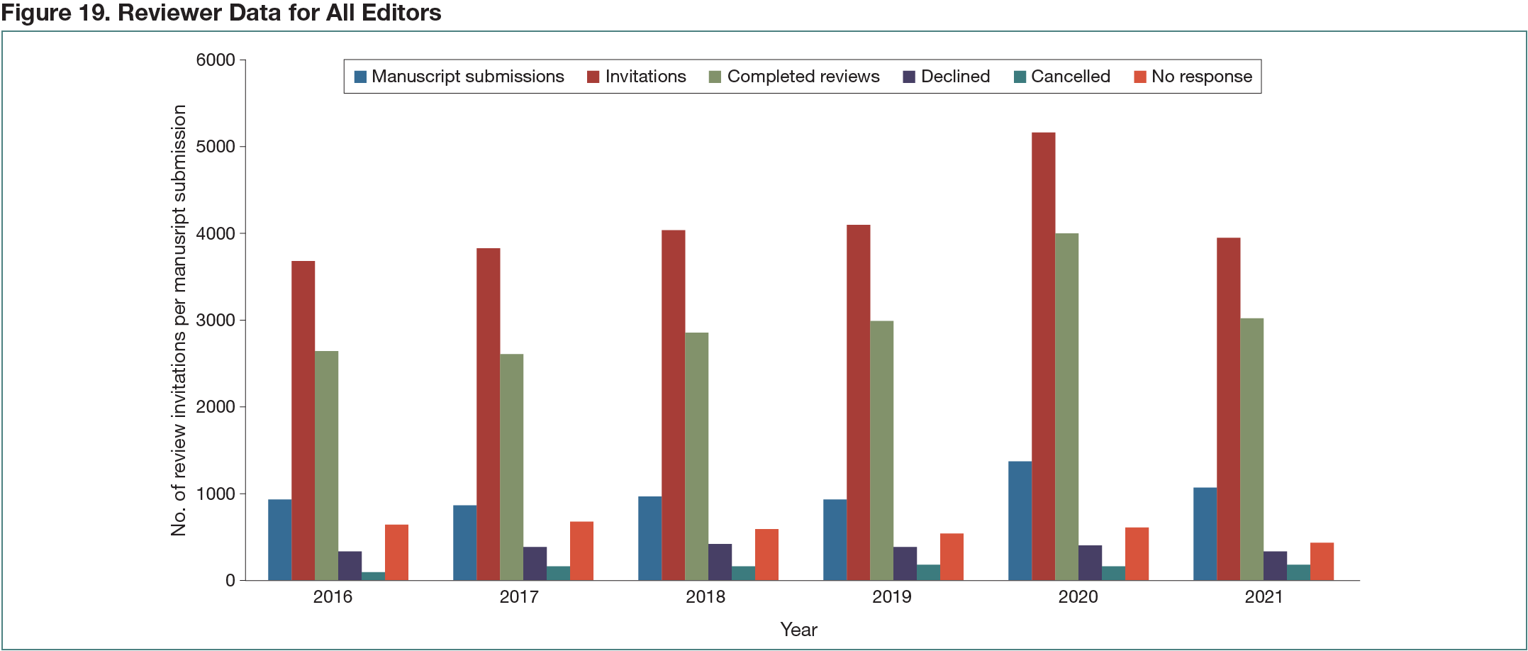 From January 2016 to December 2021, the journal received 872 to 1379 submissions per year (mean of 1024 submissions per year) for which 24,766 review invitations were sent, 17,306 by the EIC (70%). Overall, 19,004 invitations were accepted, of which 18,100 were completed on time (73%), 904 were initially accepted but cancelled due to noncompletion of the review (4%), 2235 invitations were declined (9%), and 3496 (14%) never received a response (Figure 19). The EIC prospectively collected 516 “reviewer-declines” e-mail responses from 474 unique reviewers representing a 23% sample of review declinations. Among these, 41% provided no reason and 34% were “busy with other commitments”; other common reasons included “away from the office” (8%), vacation (7%), and family obligations (2%), among others. Conflicts of interest were cited in 2% of declines and in less than 1% allegations of scientific misconduct were made by associate editors or reviewers for other journals. These cases involved the same manuscript and allegations of duplicate submission; the manuscript was withdrawn. Fourteen percent of declining reviewers suggested alternate reviewers (often with e-mail addresses). Reasons for declining did not change over time. Over the 6 years, EIC invitations became less likely to be declined and reviews cancelled for delay decreased. This appeared to coincide with development of a mentored peer-review program and institution of high-profile reviewer awards at the Society annual meeting. These data also encase the pandemic when editorial board members and reviewers were very involved in acute care of patients with COVID-19.