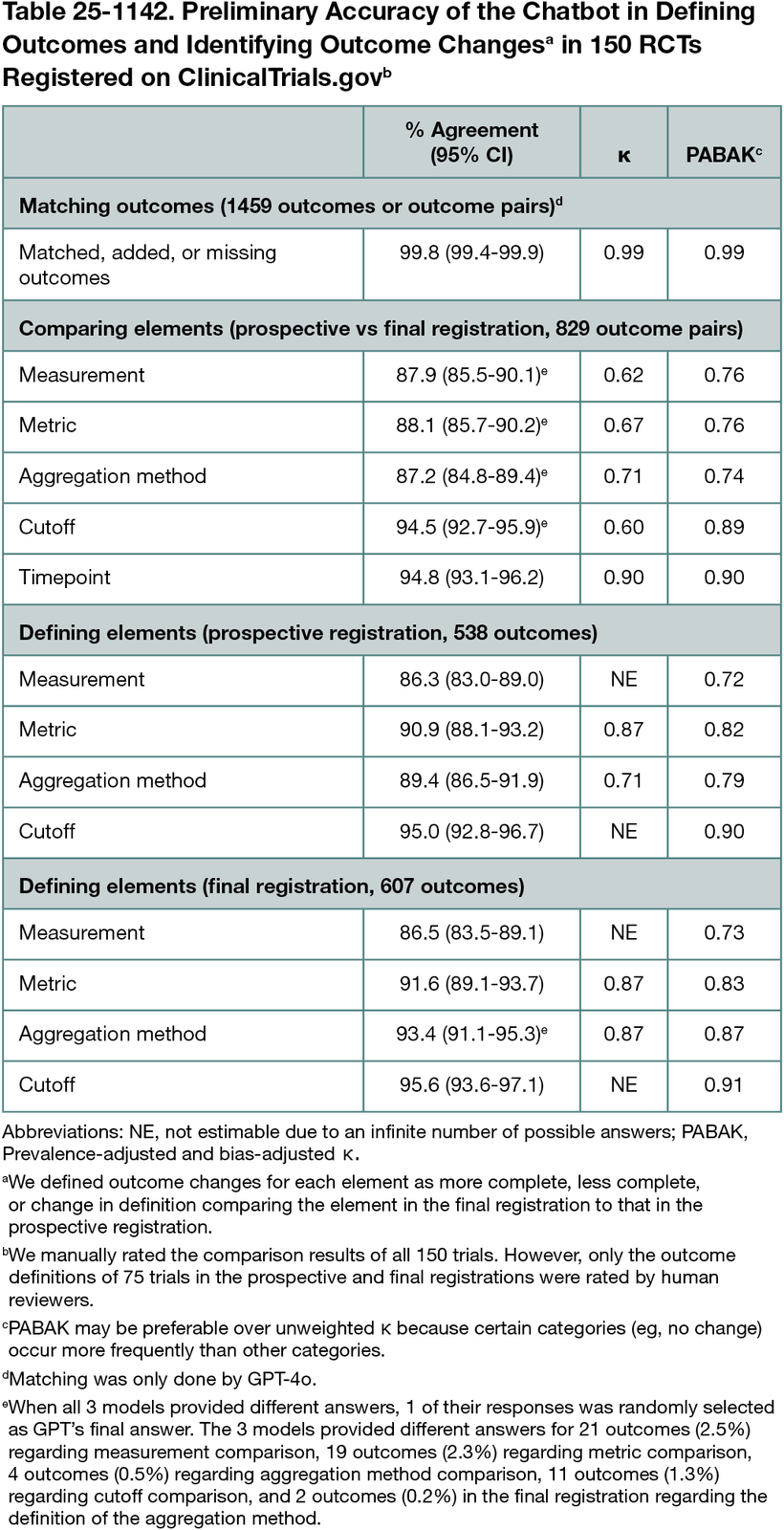 The 150 validation trials reported a mean (SD) of 6.9 (5.0) outcomes in prospective registrations and 8.4 (6.0) outcomes in final versions. The final versions included 832 outcomes matched with prospective registrations and 428 additional outcomes and omitted 199 outcomes from prospective versions. We achieved 99.8% (95% CI, 99.4%-99.9%) accuracy in matching outcomes between versions (Table 25-1142). Accuracy for detecting changes was 87.9% (95% CI, 85.5%-90.1%) for measurement, 88.1% (95% CI, 85.7%-90.2%) for metric, 87.2% (95% CI, 84.8%-89.4%) for aggregation method, 94.5% (95% CI, 92.7%-95.9%) for cutoff, and 94.8% (95% CI, 93.1%-96.2%) for time point. On average, the language learning models completed the entire process (ie, matching, defining, comparing) in approximately 2 minutes per trial. It took humans 27 minutes per trial to evaluate the chatbot’s response.