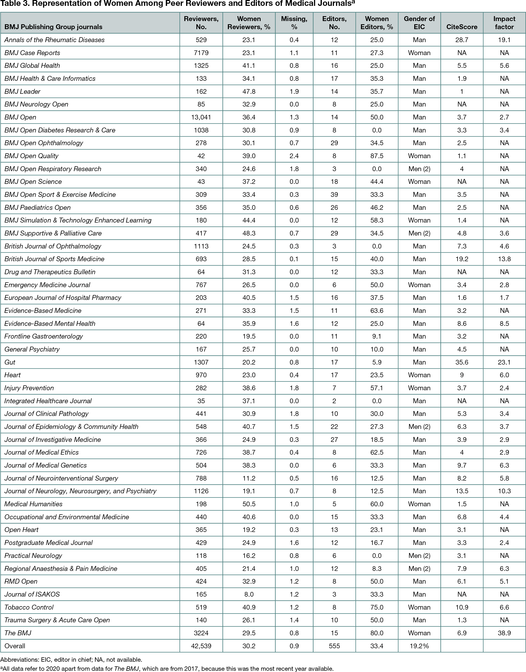 Overall, this study included 47 of the 74 journals in the BMJ Publishing Group because data were not publicly available for the remaining journals (Table 3). Women accounted for 30.2% of the 42,539 peer reviewers, with marked variation ranging from 8% in the Journal of ISAKOS to 50% in Medical Humanities. Women represented 33.4% of the 555 editors, including 19.2% of the 52 editors in chief. There were 5 journals with more than 1 editor in chief, all of which had 2 men as editors in chief. There were 5 journals with no woman among the editors and 12 journals in which women’s representation as editors was 50% or greater. Among those 12 journals, 7 had a woman as editor in chief. There was a moderate positive correlation between the percentage of women as editors and as reviewers (Spearman correlation coefficient, 0.590; P < .001). The percentage of women as editors excluding editors in chief was higher when the editor in chief was a woman than a man (53.3% vs 29.2%; P < .001). The percentage of women as peer reviewers was also higher in journals with a woman as editor in chief compared with a man (32.0% vs 26.4%; P < .001). There was no significant correlation between women’s representation and the journal CiteScore (Spearman correlation coefficient, −0.288; P = .07) or impact factor (Spearman correlation coefficient, −0.343; P = .09). This study has some limitations, such as using binary prediction of gender based on given names, relying on data for accepted rather than invited reviewers, and not accounting for the number of reviews performed by each individual.